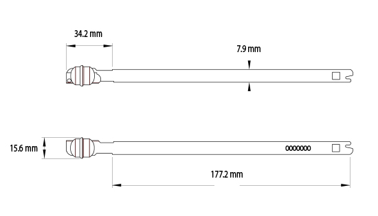 Die Plombe muss mit einem Seitenschneider entfernt werden. Die Metallplombe hat eine Gesamtlänge von 210 mm und eine Breite von 9,5 mm. Die maximale Einsatzlänge beträgt 196,5 mm.